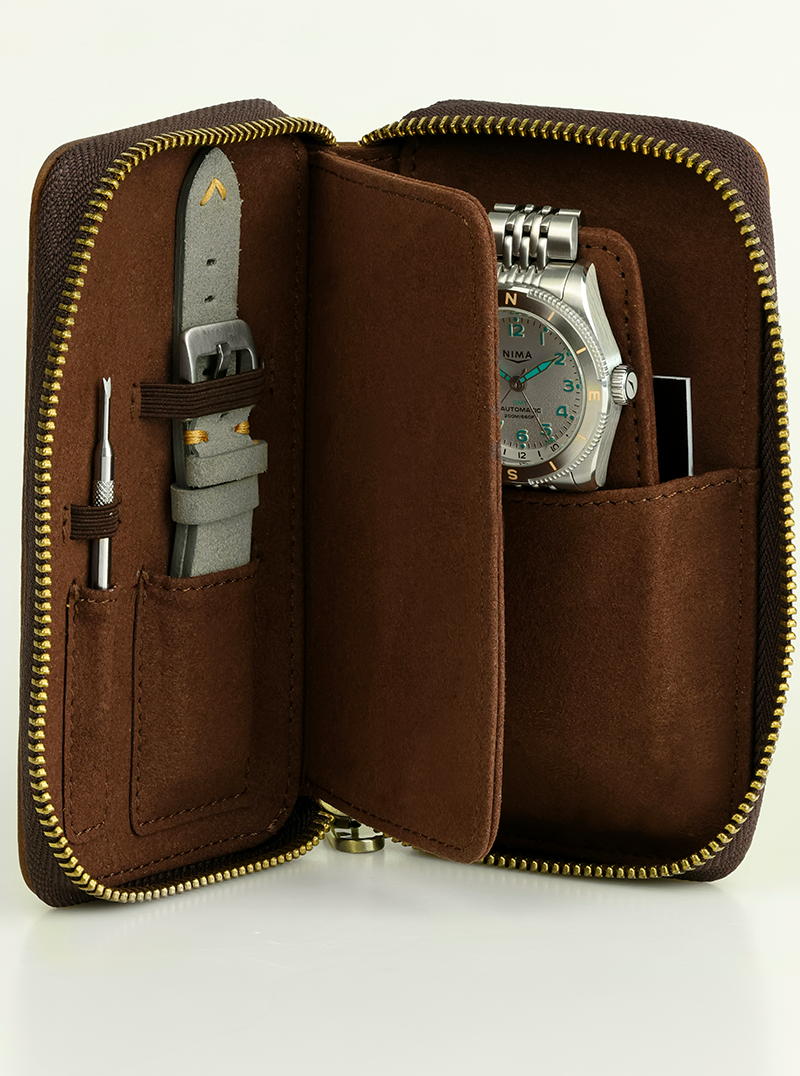 Stage one ti arriverà in una comodissima pochette da viaggio in vera pelle, utile per trasportare un secondo orologio quando viaggi. Nel corredo è incluso anche un fantastico cinturino in pelle scamosciata con impunture dello stesso colore degli indici della ghiera di Stage One, cinturino artigianale e realizzato in Italia. Inoltre un pratico strumento per la il montaggio e la rimozione del cinturino.