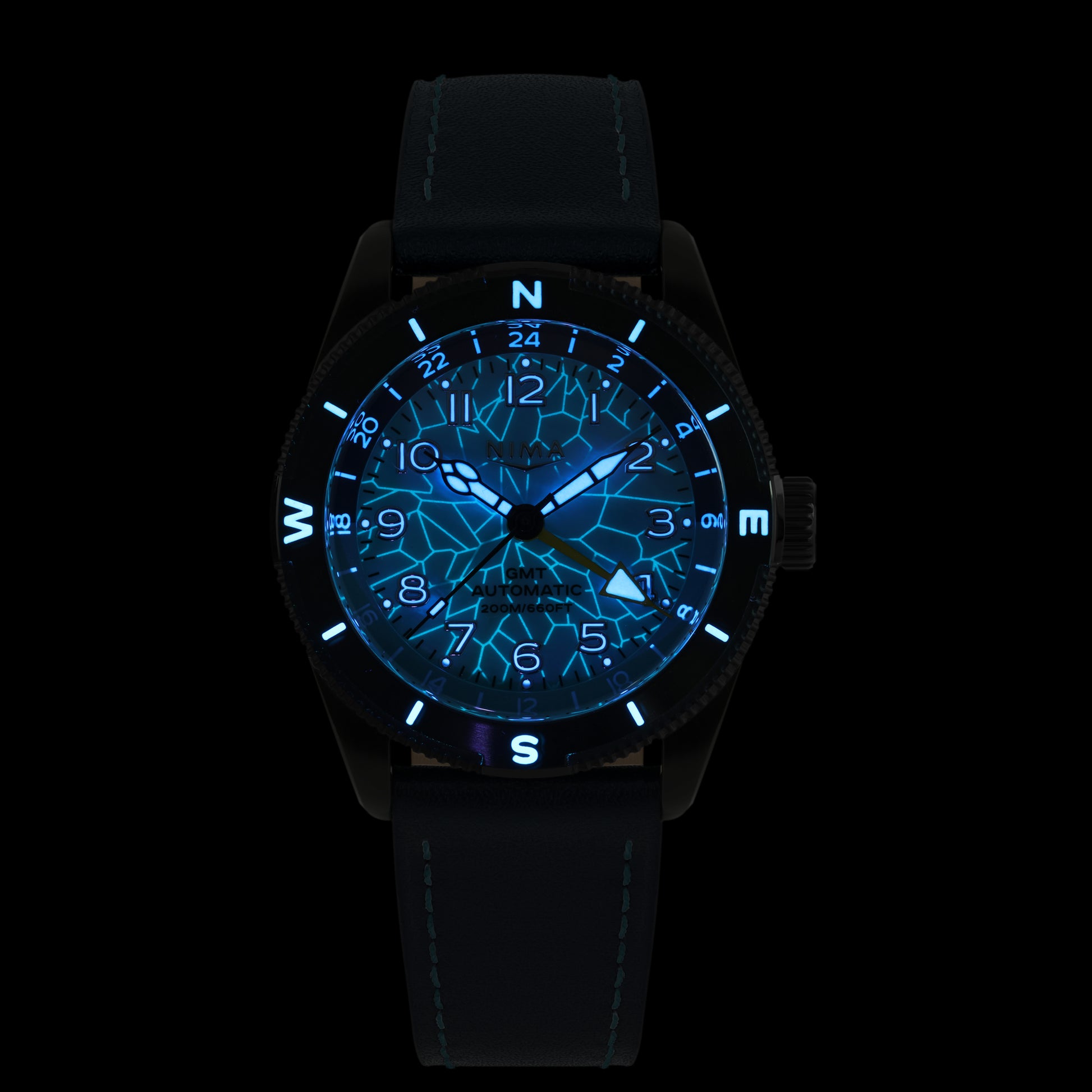 Stage One Ice Breaker Shadow, dedicated to melting frozen mountain lakes. The blue mother-of-pearl dial features a unique finish, a fragmented aesthetic reminiscent of sheets of ice breaking, letting in light. These cracks are masterfully filled with luminescence, resulting in a stunning effect in the dark.