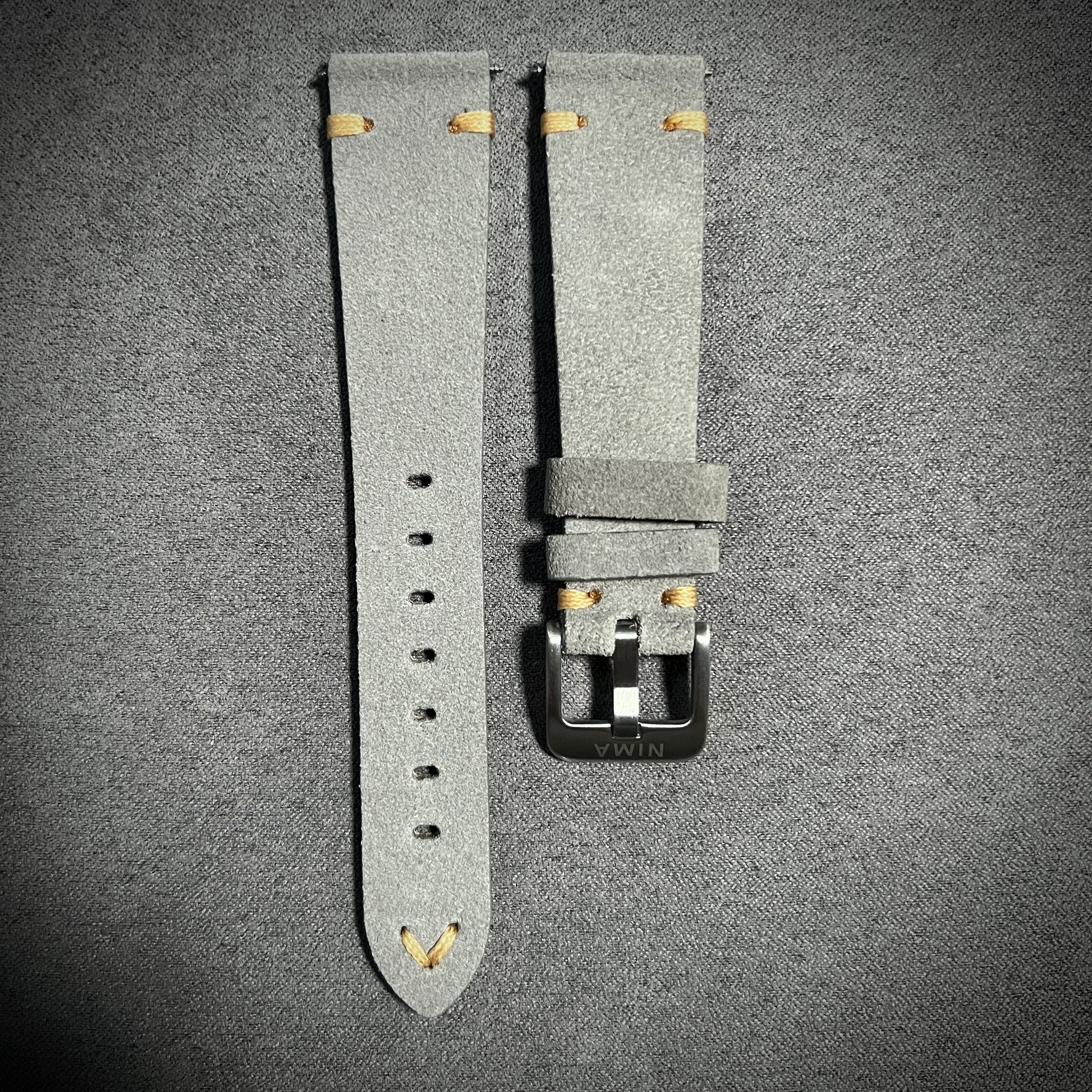 Cinturino artigianale in pelle scamosciata grigia con impunture beige. Realizzato a mano in Italia. Fibbia logata in acciaio inossidabile.